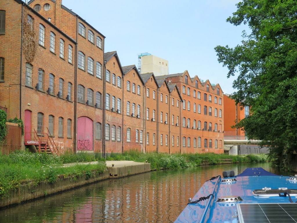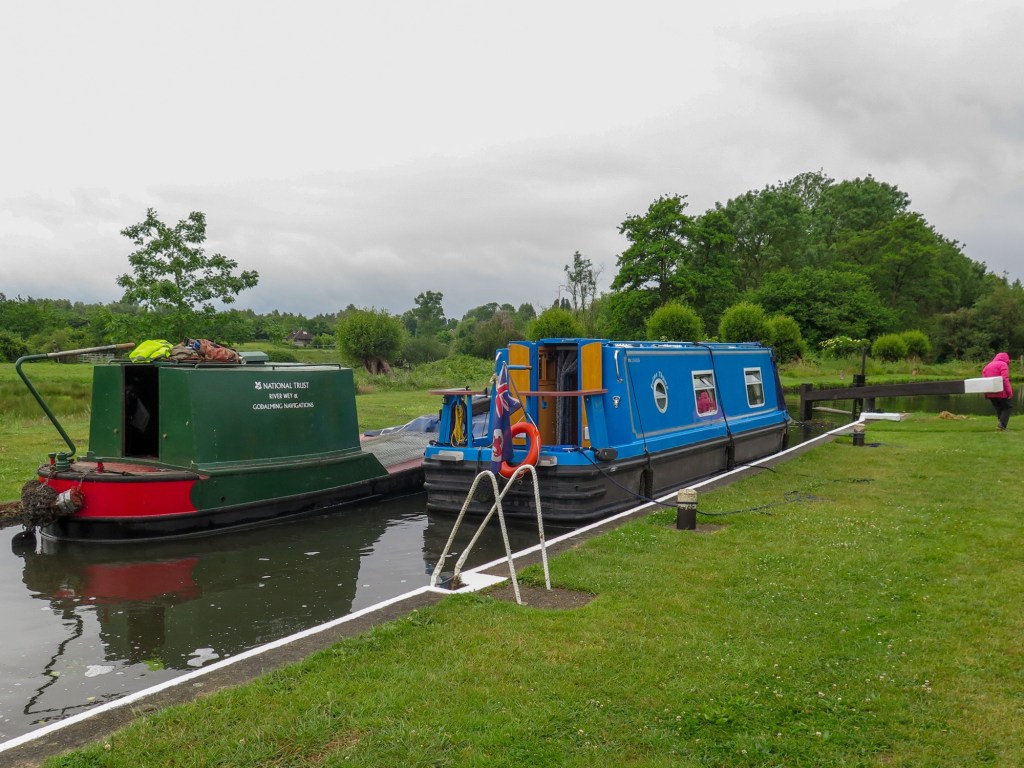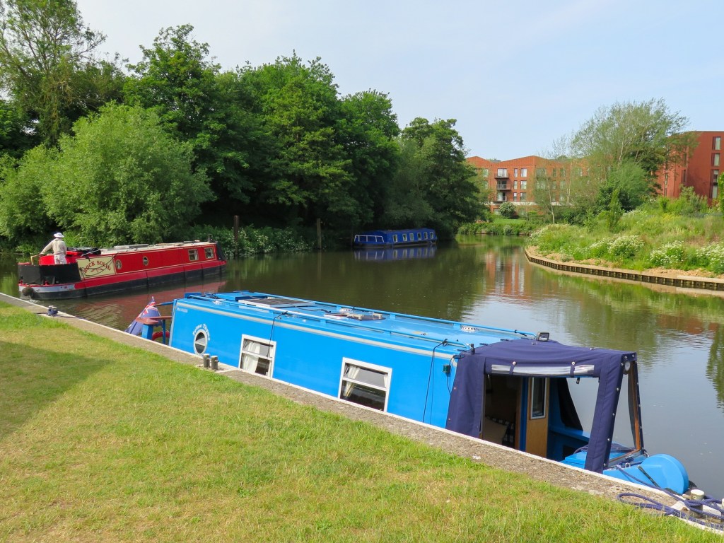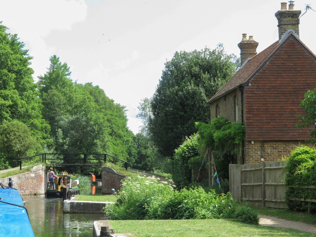 But after the first lock we catch up with our nemesis from a few days ago, a 70’ wide beam who only just fits in the locks and has to slow right down negotiating corners or any other long boats. Rather than trail in his wake we pull over at New Haw Lock for provisions and lunch.