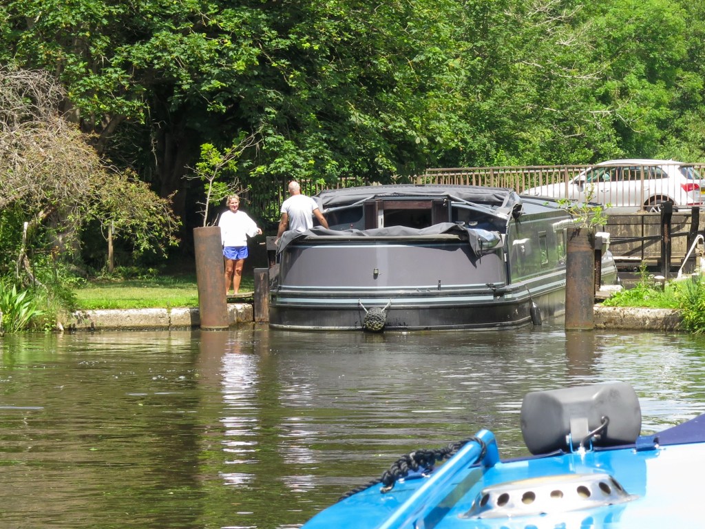 70’ boat to left, I squeeze in on right with H watching, Bowers Lock