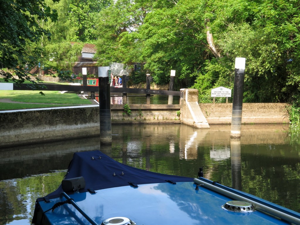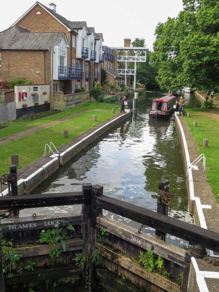 Approaching Thames Lock, where the Wey joins the Thames, we see the widebeam finally entering its natural habitat. Looking back the entrance to the Wey is hardly visible.