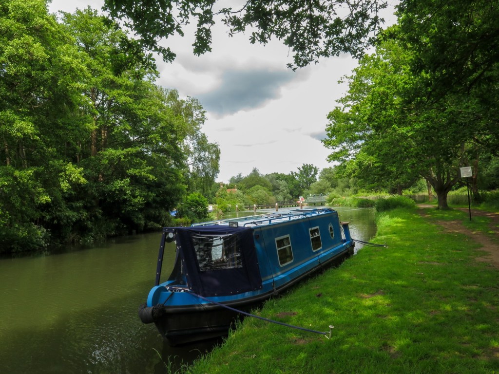 After 10 minutes the drizzle turned into showers, then heavy rain. Time for the waterproofs as H retreated into the cabin. Turning into the Wey, Thames and Shepperton junction I spied a 40’ long 24 hour free mooring….which we quickly occupied ! The rain continued on and off all afternoon, with the sun finally emerging as I write this blog at 7pm. We will lock up the Wey tomorrow, with a few services and shopping required.