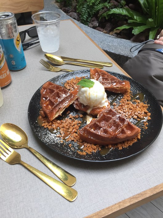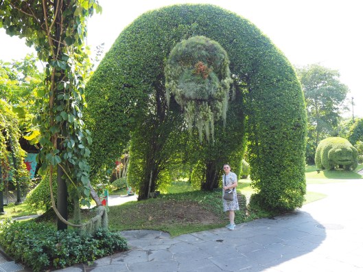 “Jane” next to a topiary King Kong. By now the heat was intense, so we retreated to a cooler food court and a salted caramel waffle, Yum !
