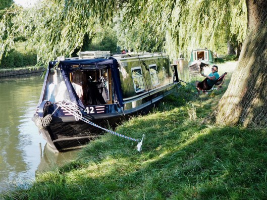 Thankfully we both got some sleep last night, and after adjusting to our commodious bathroom arrangements, set off. At first it started out well, but then every lock was set against us, we had to share with some inexperienced hirers and got squashed, and it’s too hot ! I was steering under an umbrella to keep from burning when I noticed the engine note changed, oh no……..not a lot of water coming out from the exhaust? As we are raw water cooled and silenced it needs a continuous supply of water, so out with the old coat hanger and prod around under the waterline. Start the engine, all ok now, must have been some weed blocking the intake, still took an hour to fix though. By then numerous boats had overtaken us, slowing us through the locks even more, especially when Angel Blue appeared, all 65′ wide beam taking up the whole river. No lock sharing with her, and friendly girls who said size does matter looking T42’s 27′!