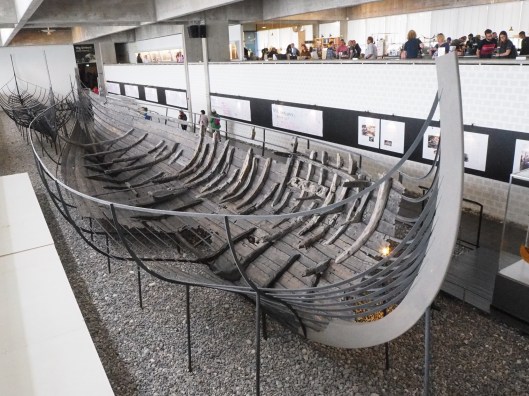 A grey day, with a little rain, saw a late start to the City of Roskilde, an hours drive from where we are moored in the center of Copenhagen. Unfortunately our guide was not the most dynamic personality, and the tour had been poorly arranged. First up was the Viking museum where 5 boats, that had been sunk in the entrance to a Fjord, have been preserved. All 5 have also been copied and built in a traditional manner in a shipyard next door. One could talk to the builders, who were still building a replica.
