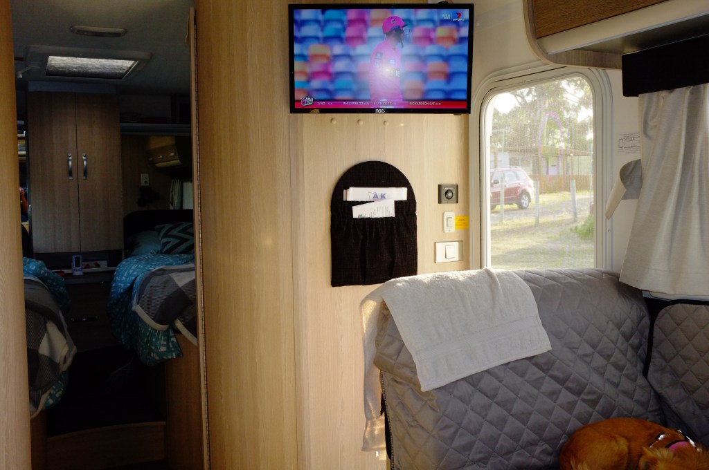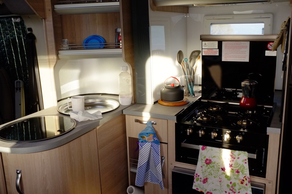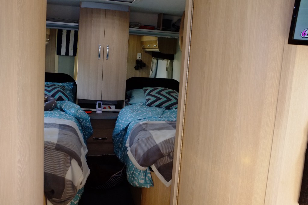Our Avida Eyre is is 7.6m long, with 2 permanent singles, seperate washroom and shower, with a slide kitchen and dinette. It’s very well designed and we’re gradually finding spots for everything.