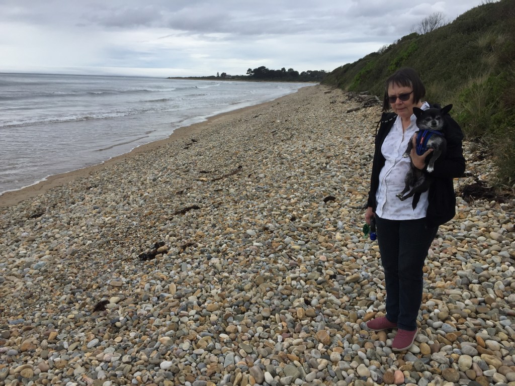 After paying for another day we then walked to the Berry Farm for morning tea, or rather Cooper was carried there. However we did walk back along the beach, which he greatly enjoyed from his “happy” tail and high stepping march. As usual Rosie lived up to her “Cyclone Rosie” name with much growling at the sand and doing donuts….