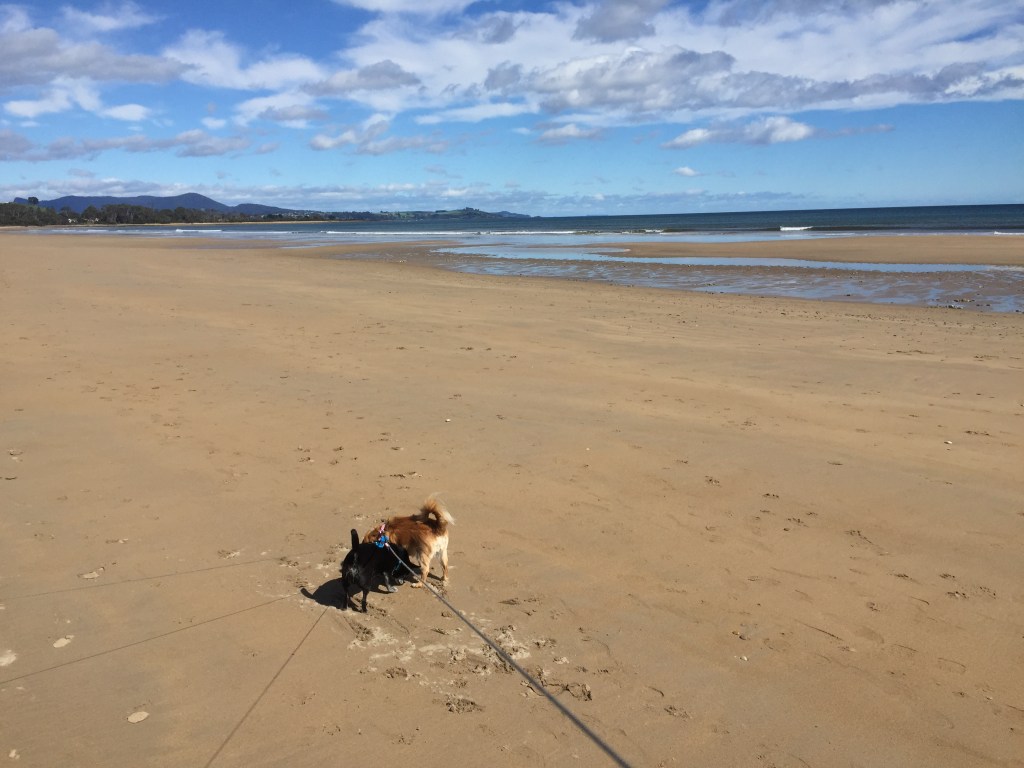 Lunch spot in PenguinHigh tide at Turners Beach and Rosie gets wet…..