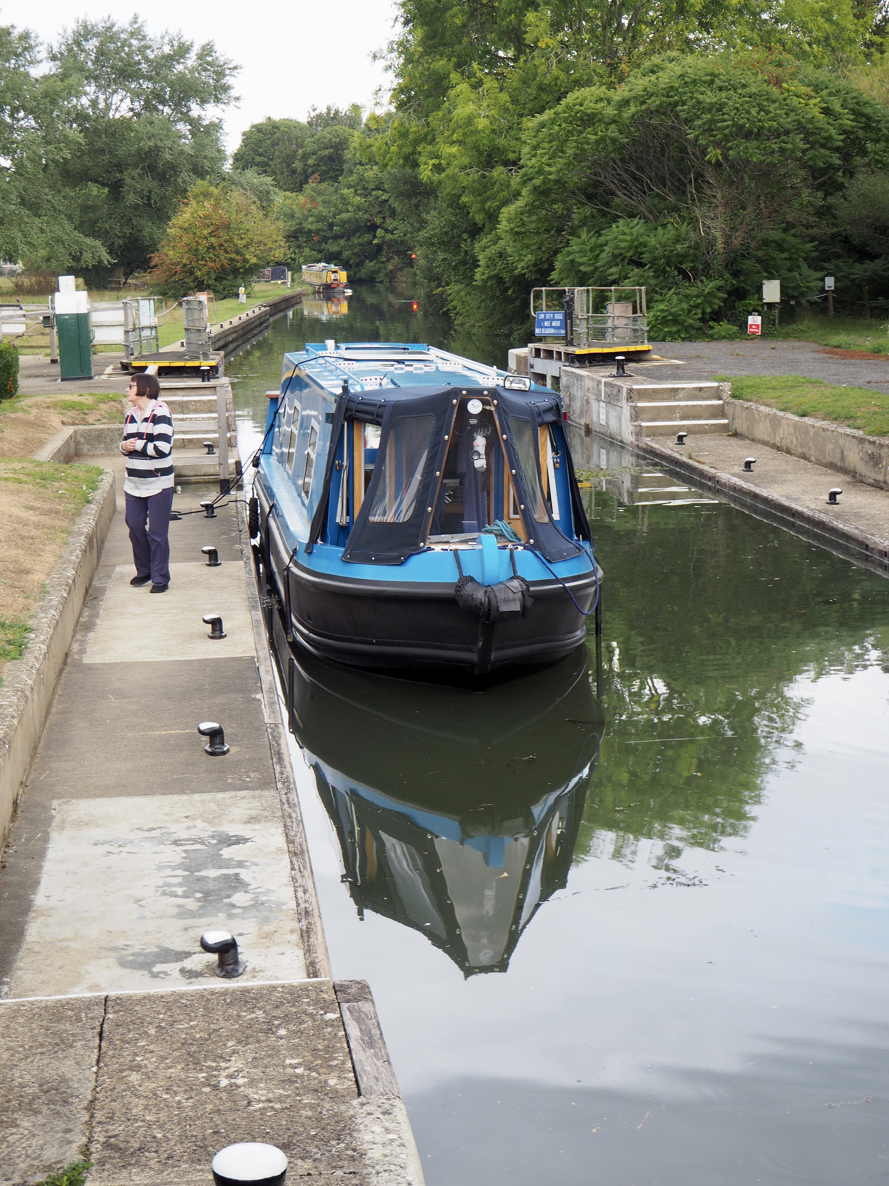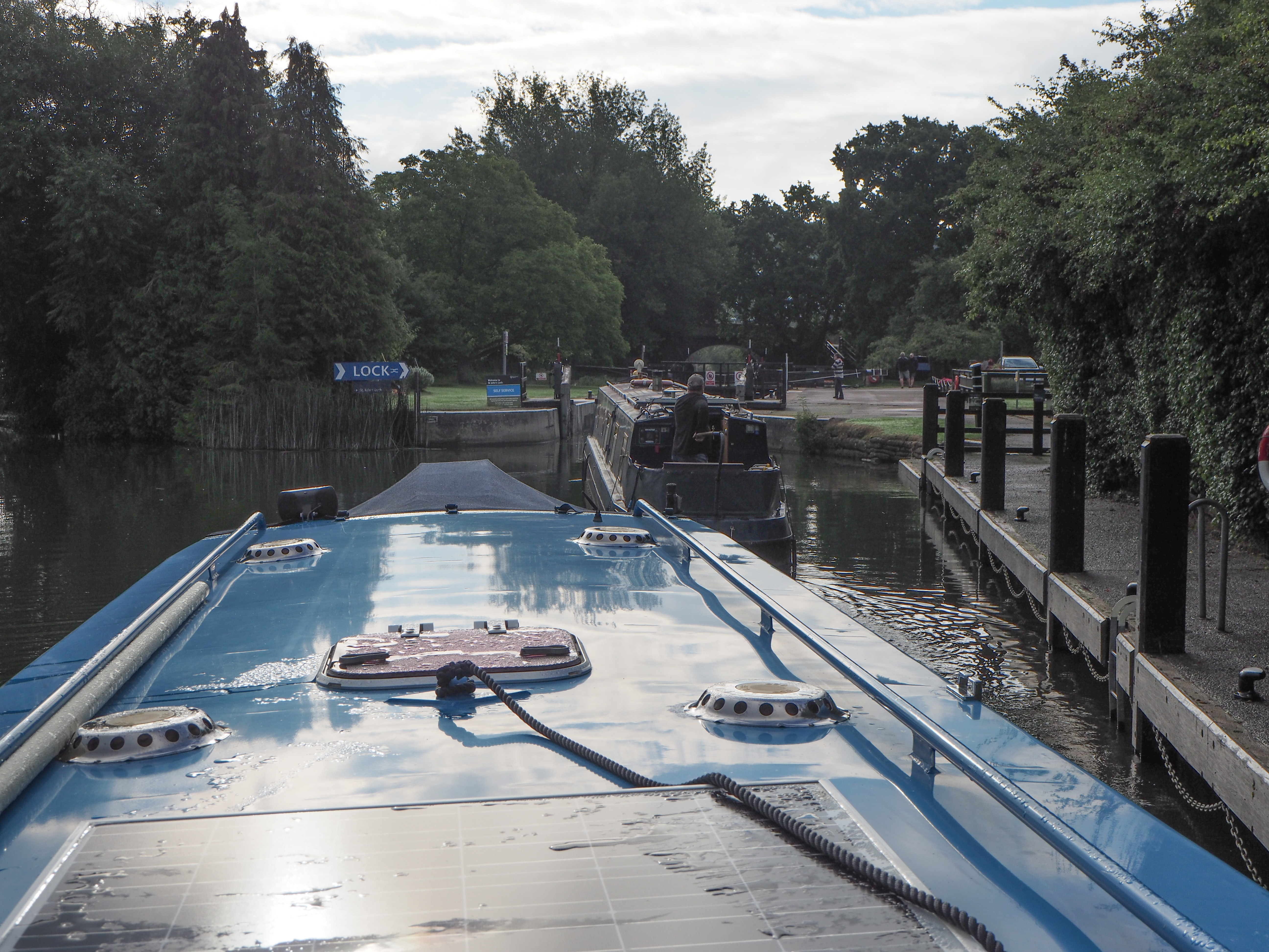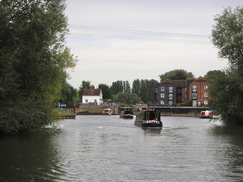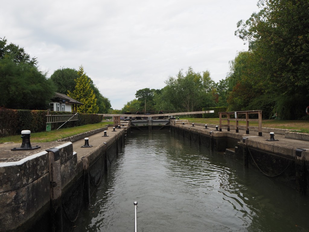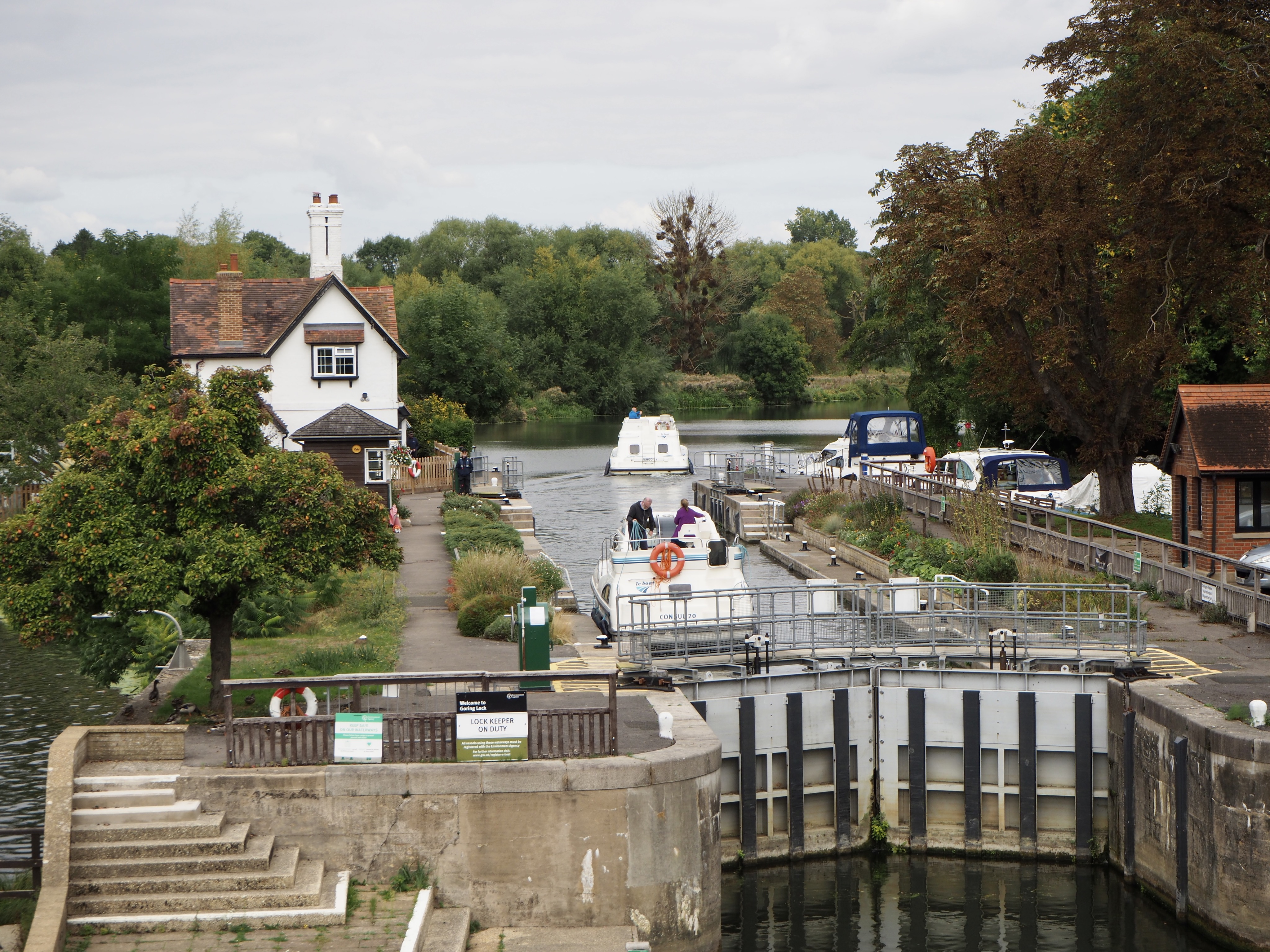 It was only in the afternoon we were told that the locks were still being manned, so we pushed off and headed down the Rowing Regatta course. First under the Henley Bridge, with its 2 figureheads, and then Temple Island at the end of the course. Time for a lock ? It’s maned !