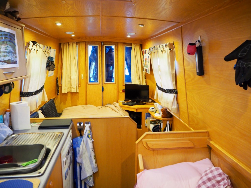 For sleeping the dinette converts to a single or bunk beds, whilst the L shaped lounge converts to a large single. Heating is provided by a gas fired hot air system, and hot water by immersion, if connected to a shoreline or by engine calorifier. She’s powered by a 21hp Barrus Shire engine, and has a flooding keel, more on that tomorrow.