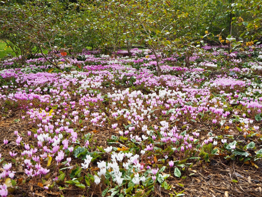 We decided to visit Wisley one more time, after packing the cases. The parking spaces were scarce, and entrance queue long, but visitors seemed to dissipate over its large acreage once in. There was a Miniature Cyclamen display, and the Autumn colours were stunning.