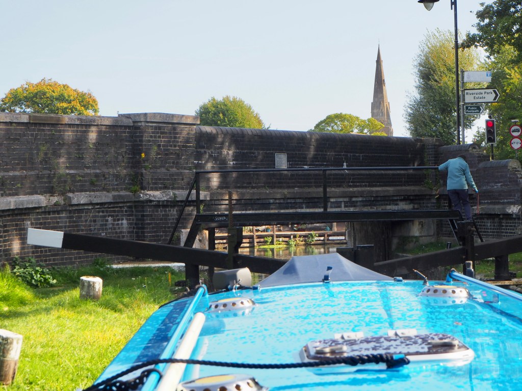 Then New Haw lock, one of the trickiest…..tiny lock arms at 45 degrees, which you have to clamber over to cross on the narrow bridge. There was also an errant swan, which had to be wrangled out of the lock before closing the gates.