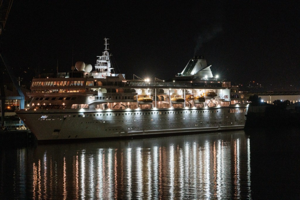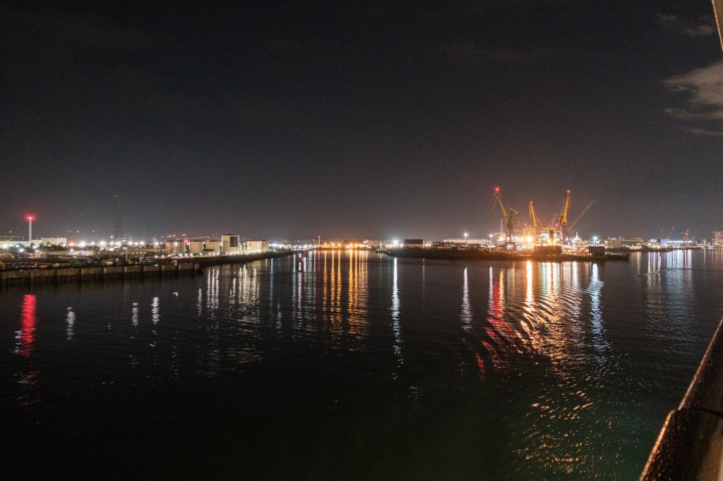 Dockyards at nightViking OrionLooking back as we sail out of Belfast Port