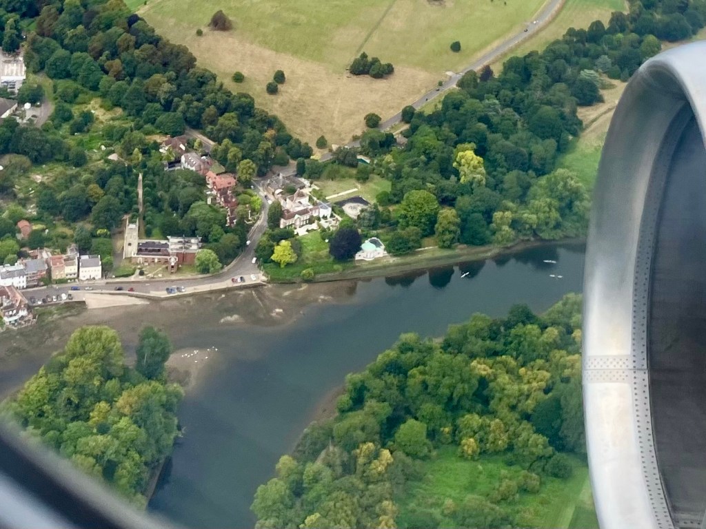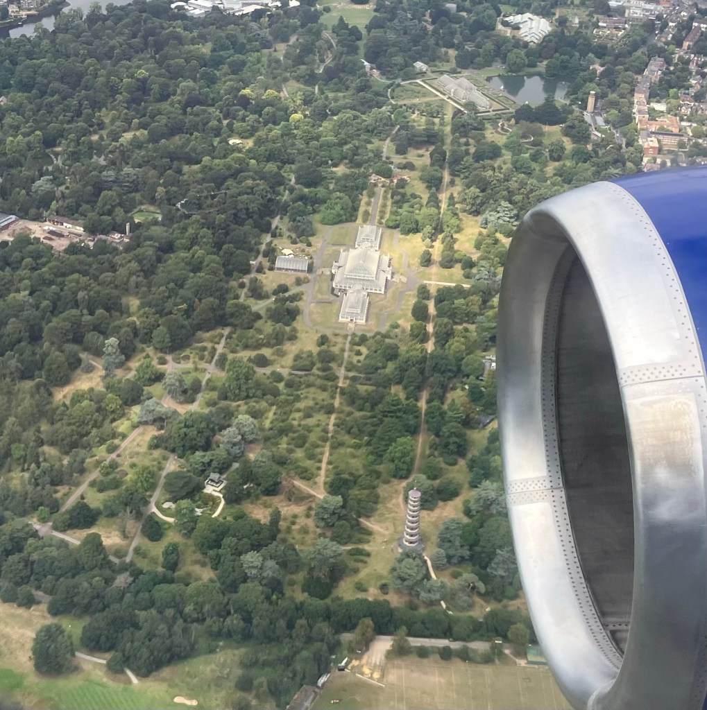 Flying over Kew’s Palmhouse and Chinese Pagoda Garrick’s Temple on the Thames