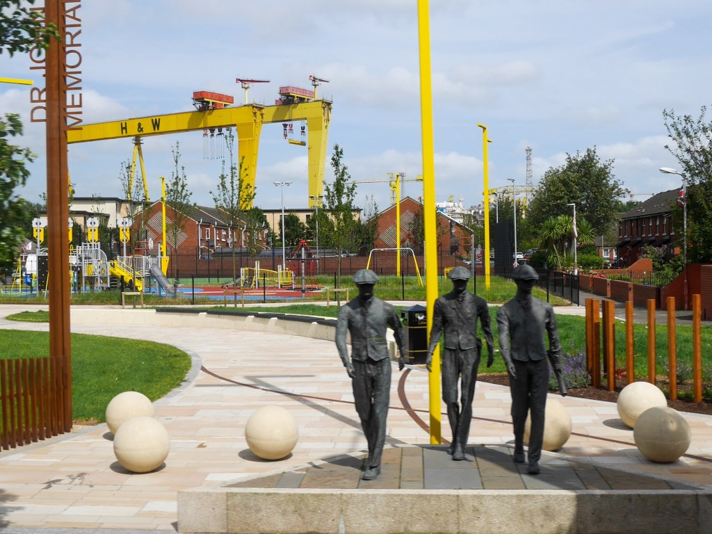 It was a beautiful day when we moored up this morning, and it’s only got sunnier and warmer ! The view from our balcony is over the old Harland and Wolfe dry dock with its emblazoned cranes, and the new angular Titanic exhibition center with all its shiny exterior plates.