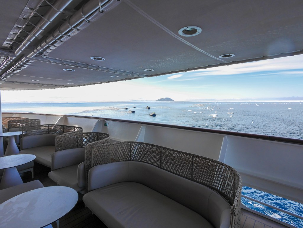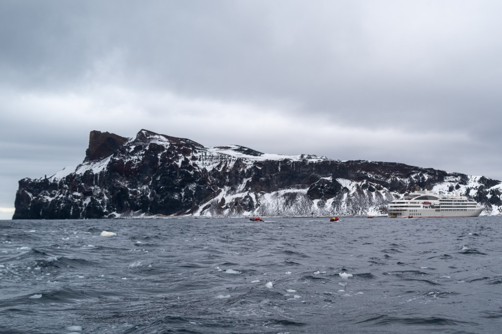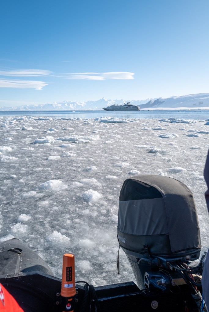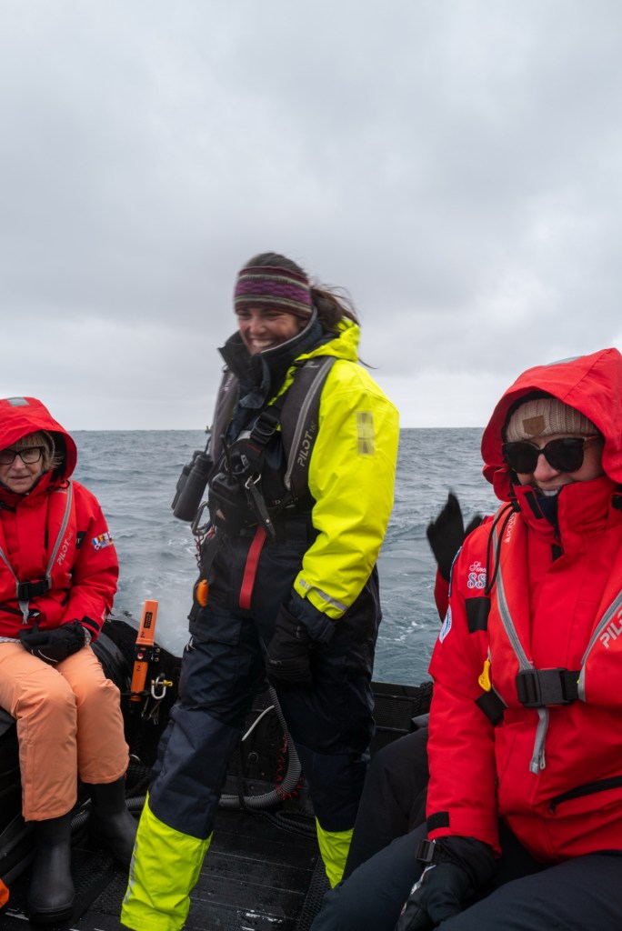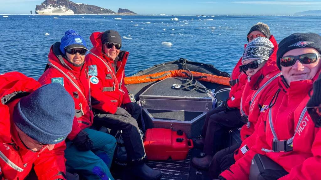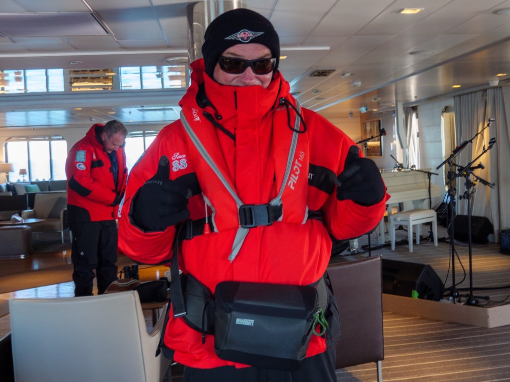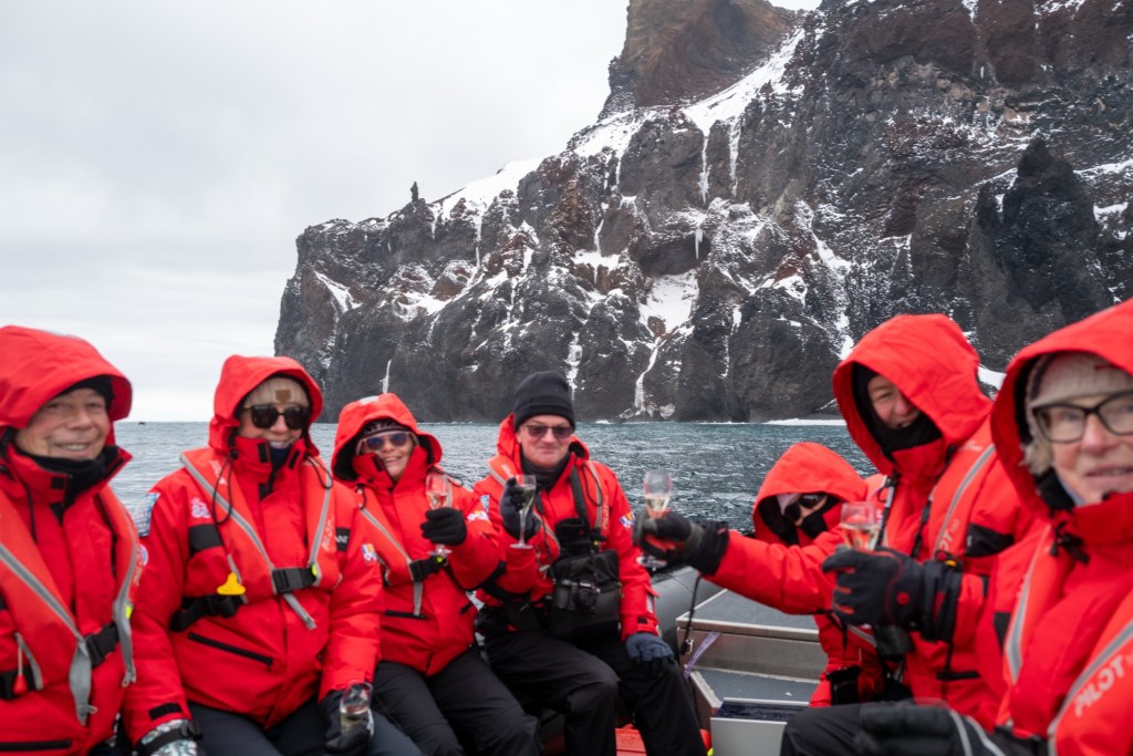We were soon called for a Zodiac briefing. There was too much swell to attempt a beach landing but we could go for a cruise. As one of the last groups away we had time for lunch and a fortifying Bailey’s Hot Chocolate. Then it was time to suit up, and board our Zodiac piloted by a very French guide called Elsa.