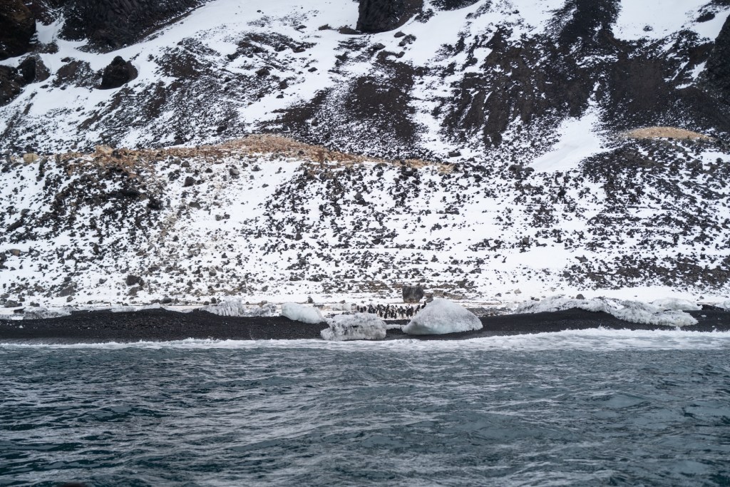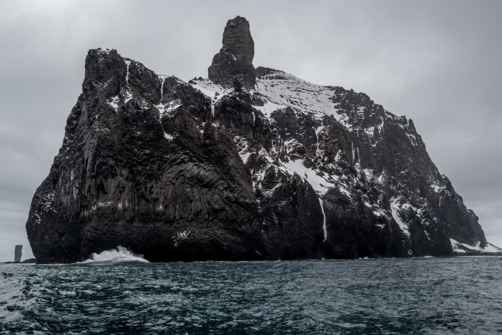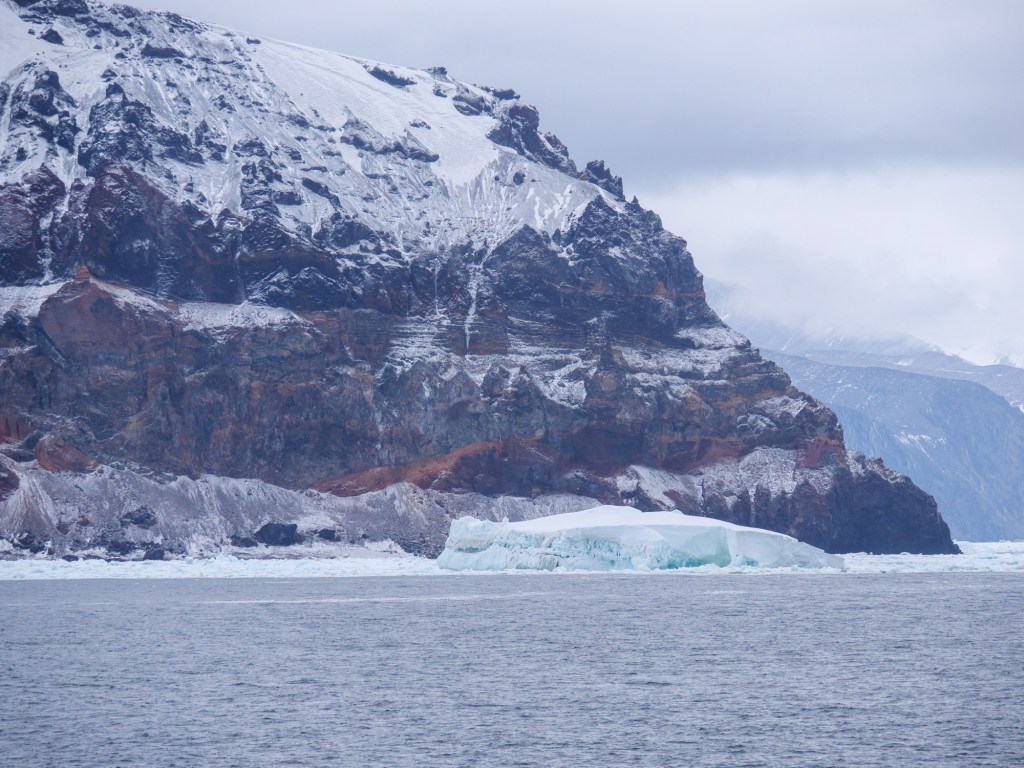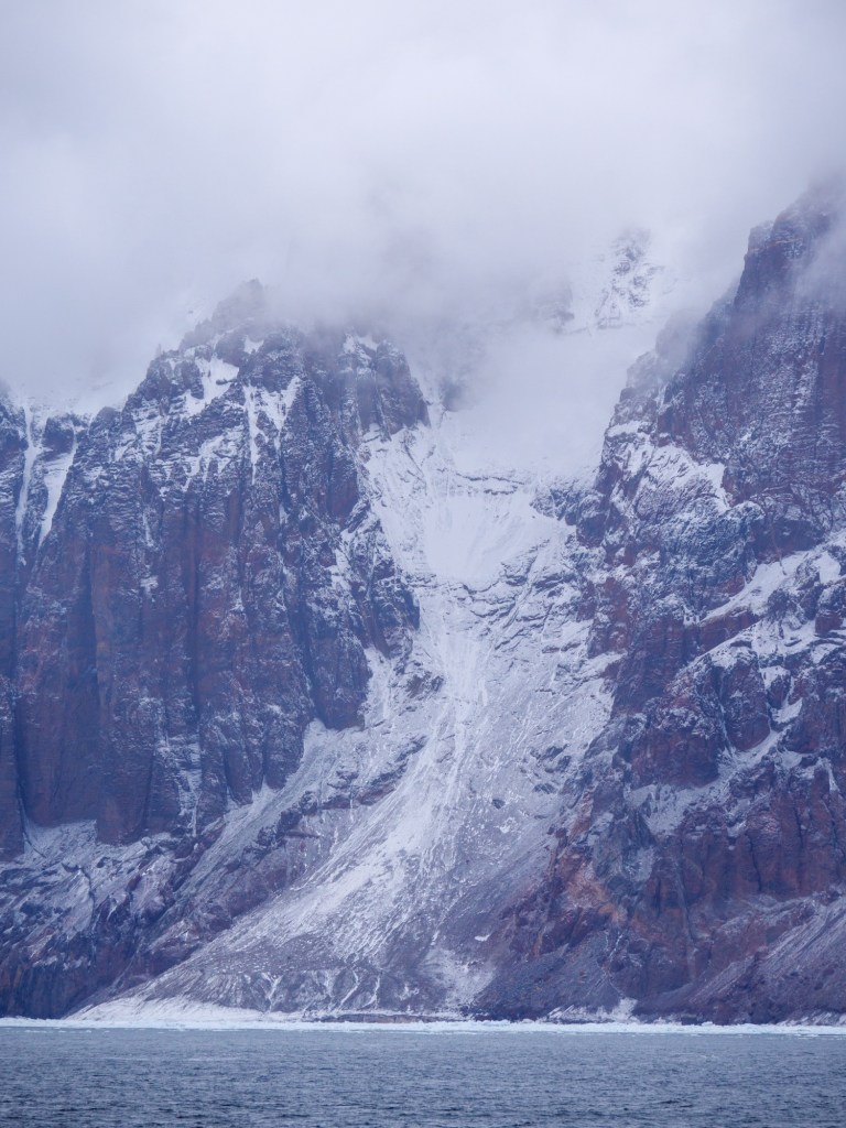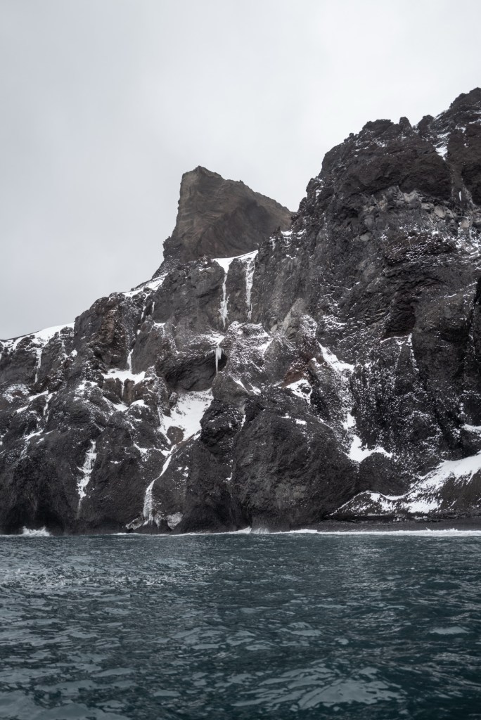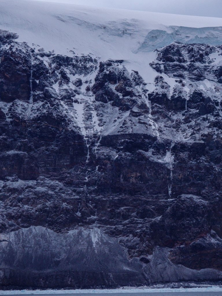 Sailing along the coast yesterday saw a complete change in the weather and scenery. Gone was the sun and pristine snow, replaced with forbidding black cliffs clothed in mist and ice.