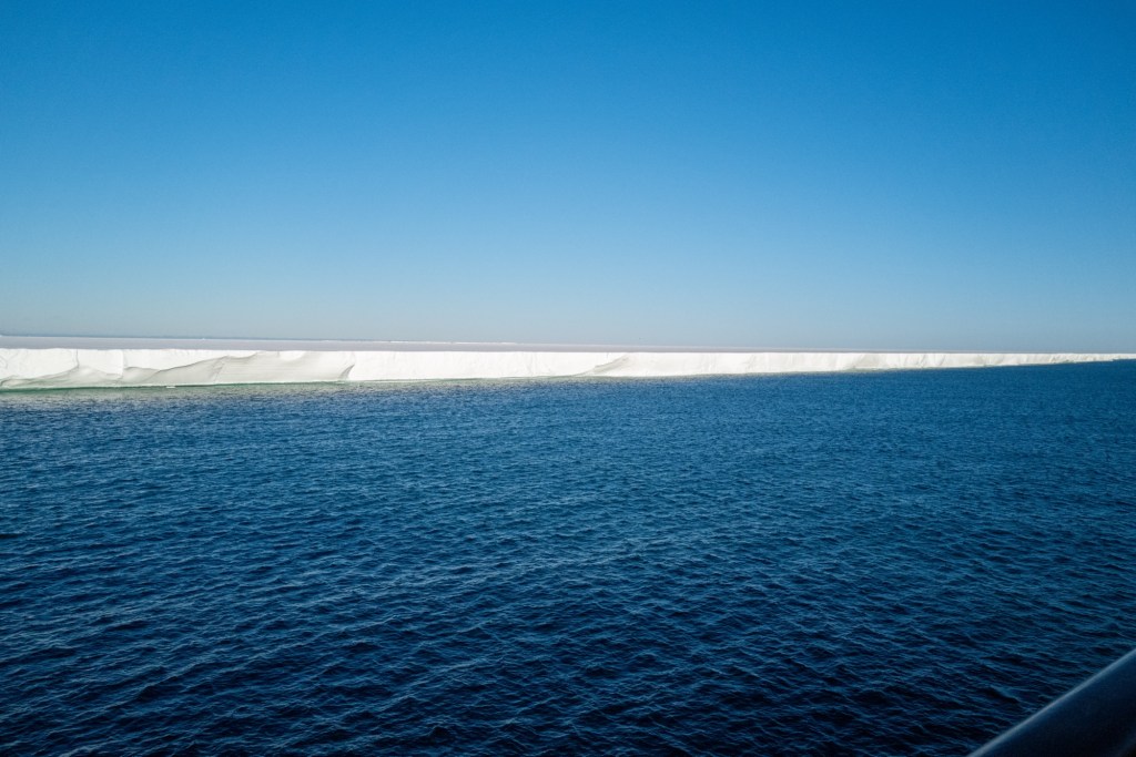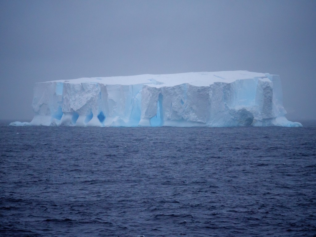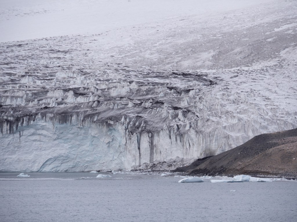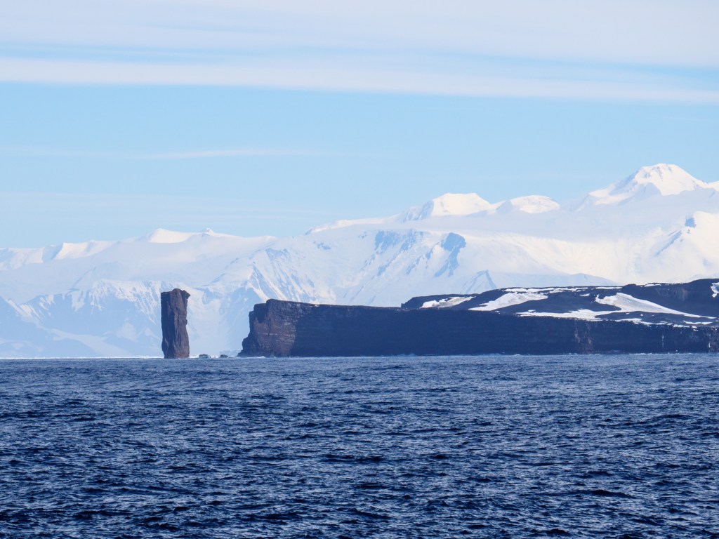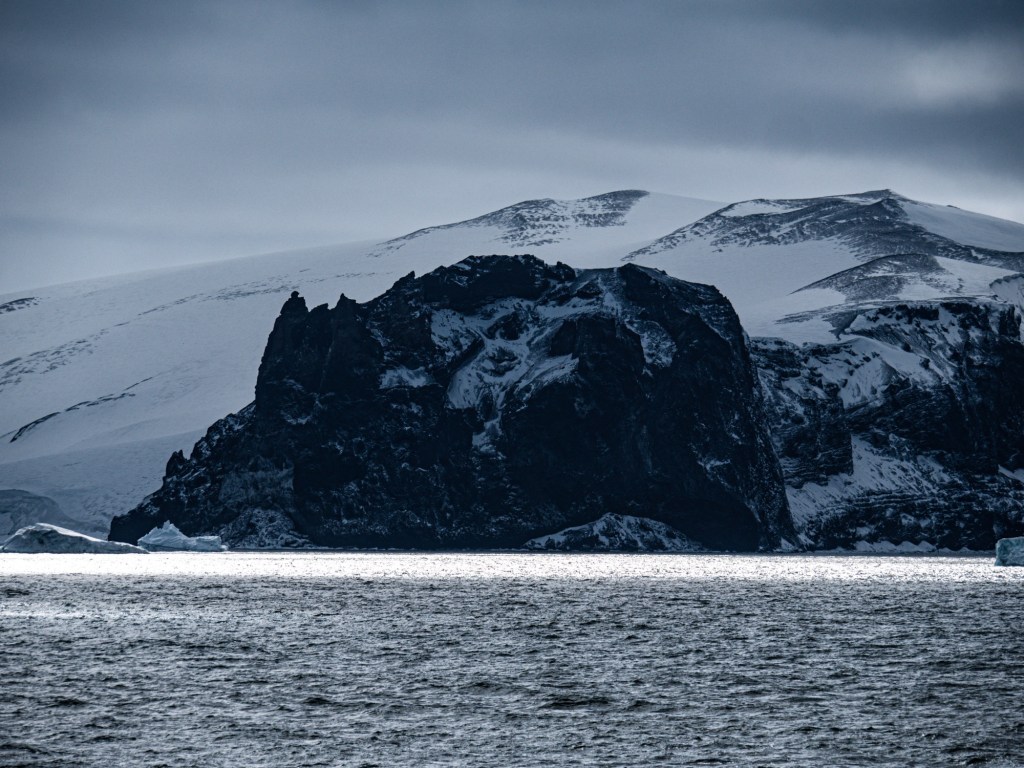 Sailing along the coast yesterday saw a complete change in the weather and scenery. Gone was the sun and pristine snow, replaced with forbidding black cliffs clothed in mist and ice.