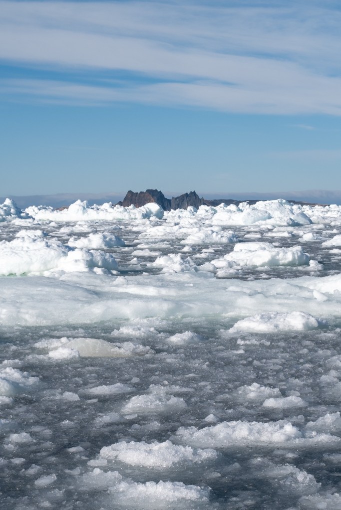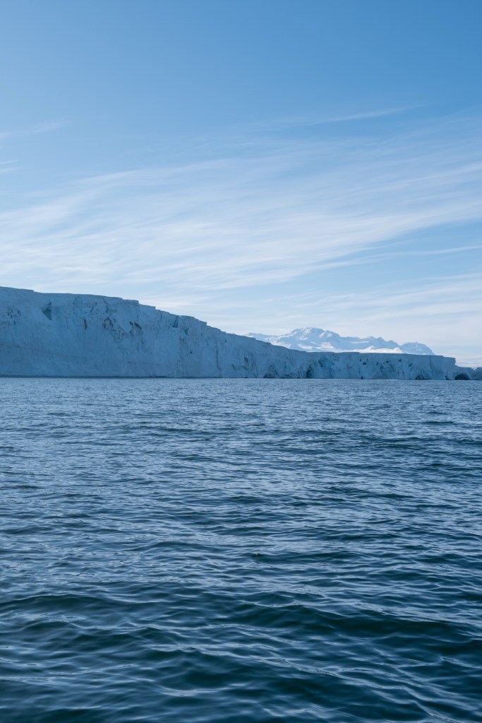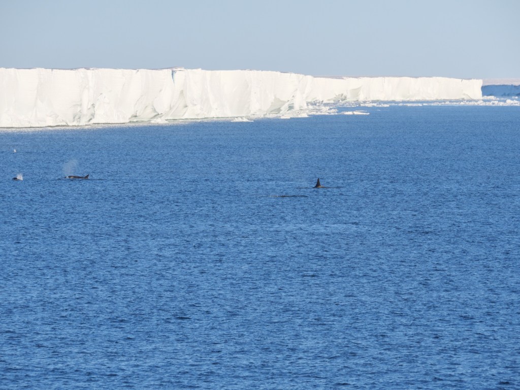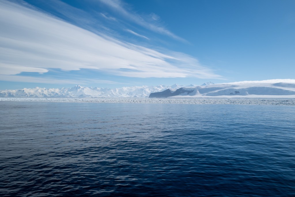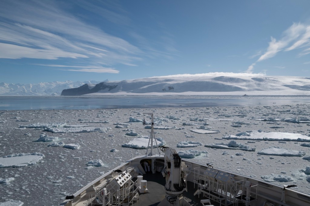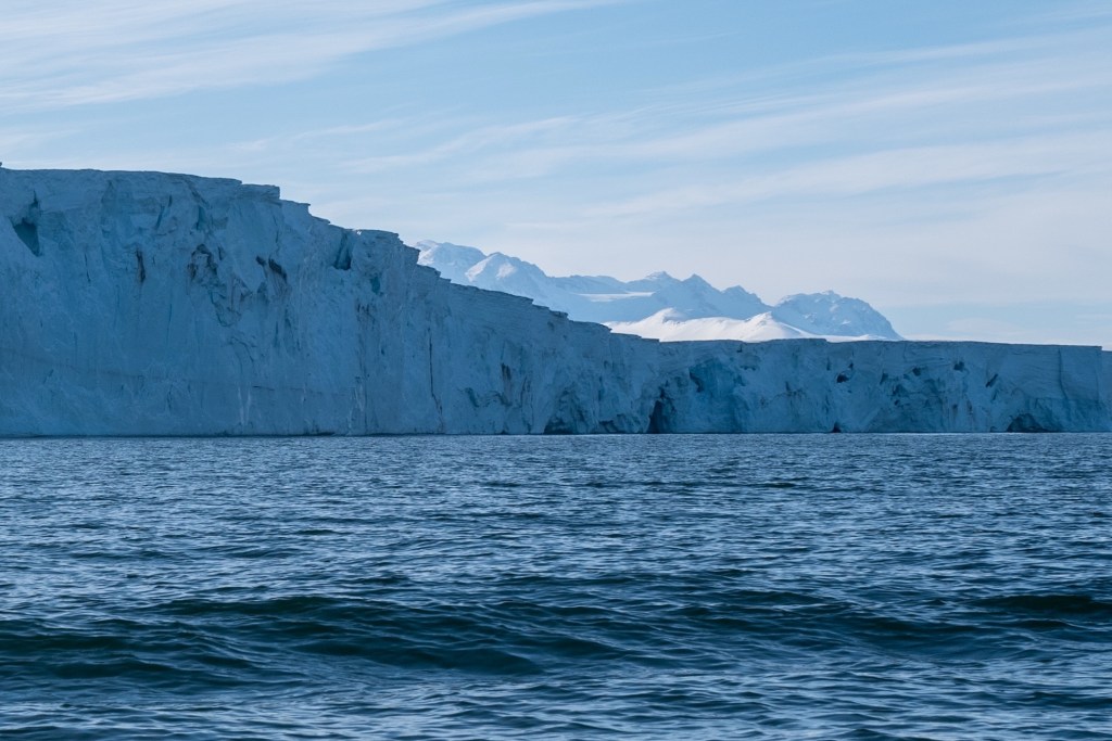 Sailing along the coast yesterday saw a complete change in the weather and scenery. Gone was the sun and pristine snow, replaced with forbidding black cliffs clothed in mist and ice.