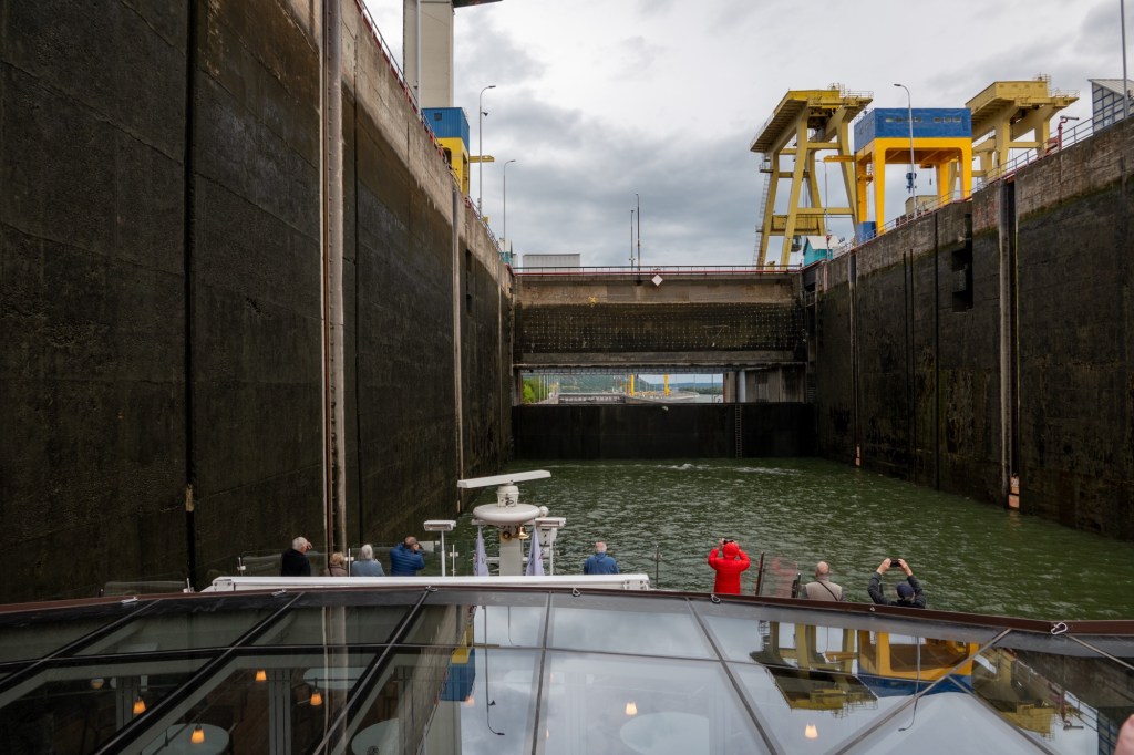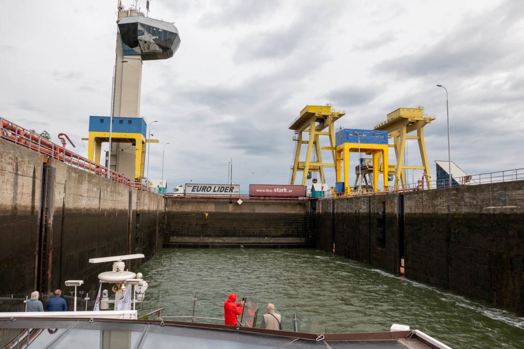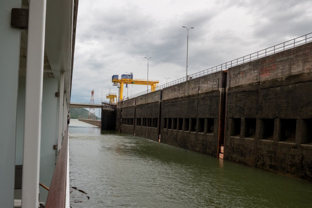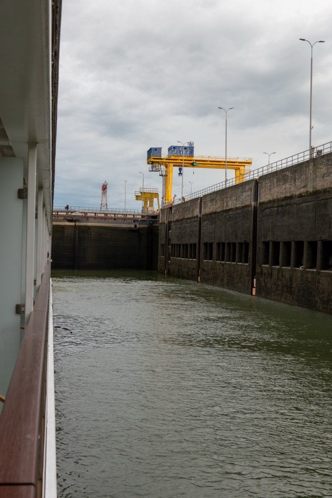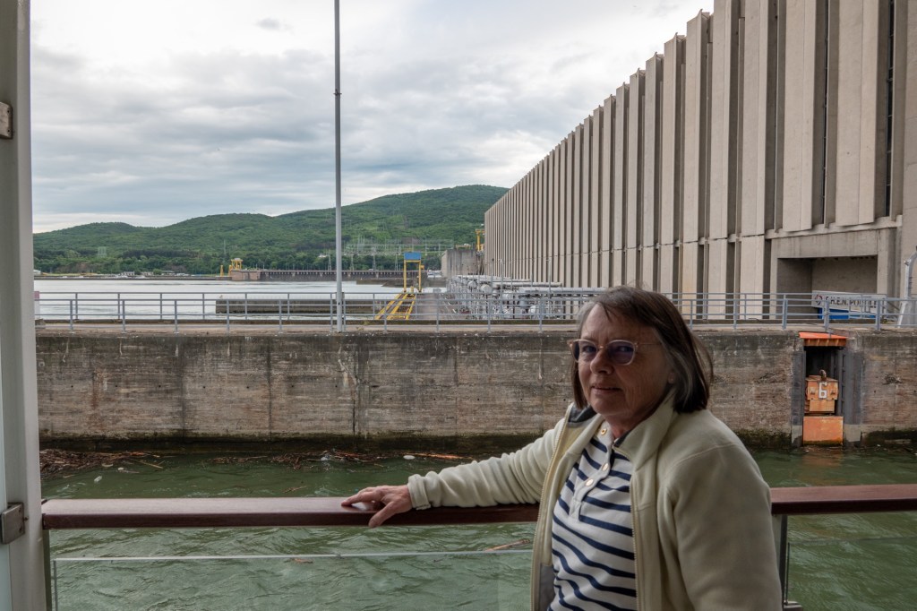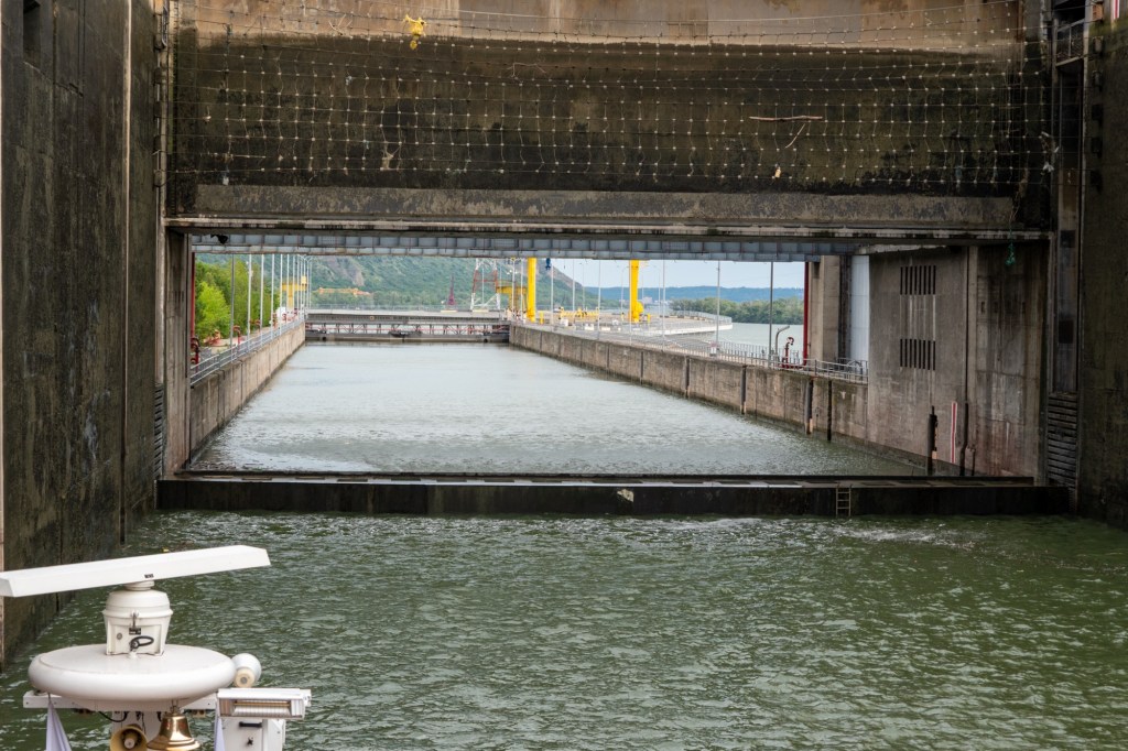 After exiting the gorges we entered the first of the 2 staircase Iron Gate locks. The first one had vertical gates, 2nd ended with more traditional side ones.